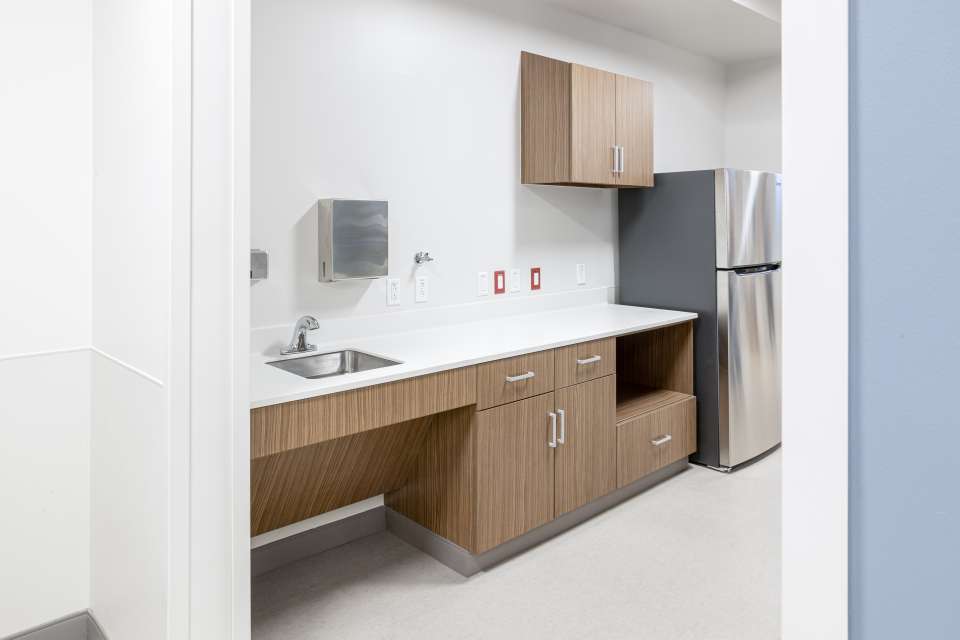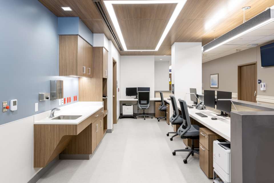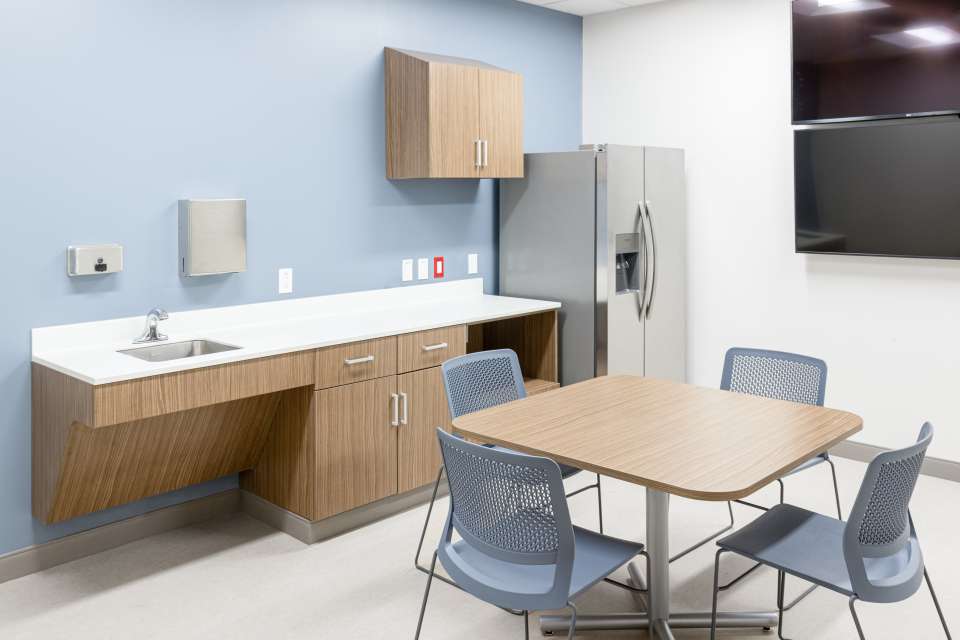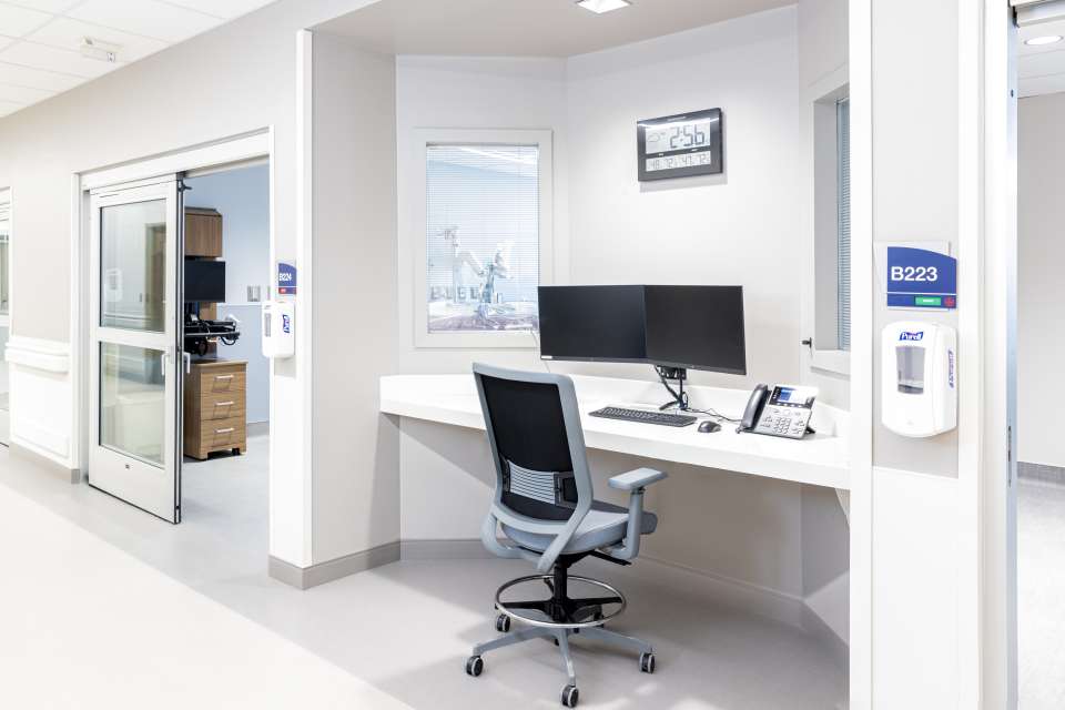 Inside, the building was intentionally designed to foster a sense of calm and care. Large windows fill each level with natural light, while spacious lounges and waiting areas create a welcoming atmosphere for patients and families. Caregiver wellness was also a top priority. With integrated nursing stations, dedicated staff respite rooms, and collaborative work areas woven throughout patient units, the space supports both high-quality care and caregiver wellbeing.