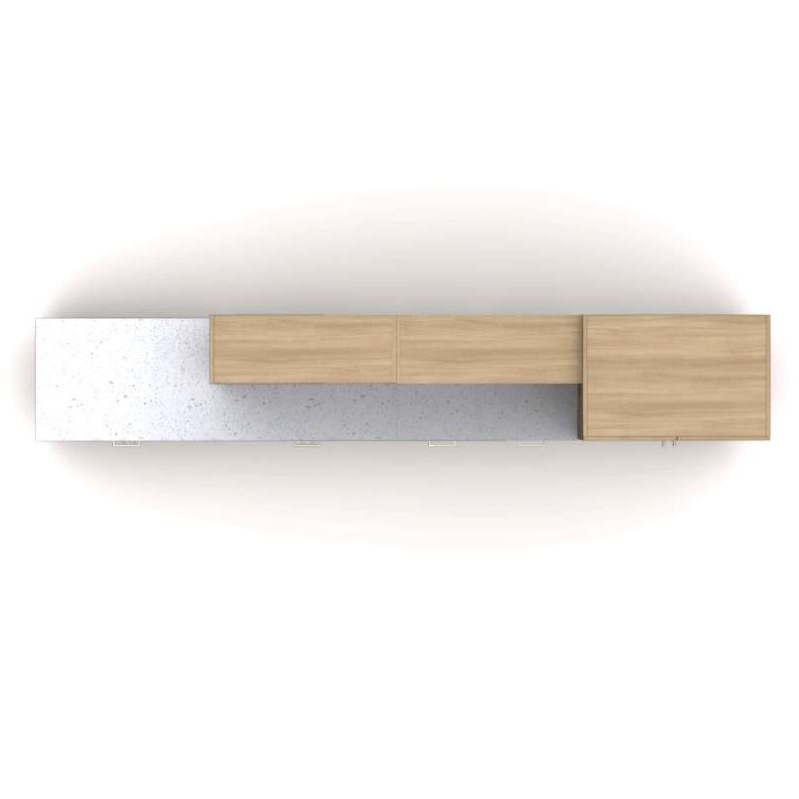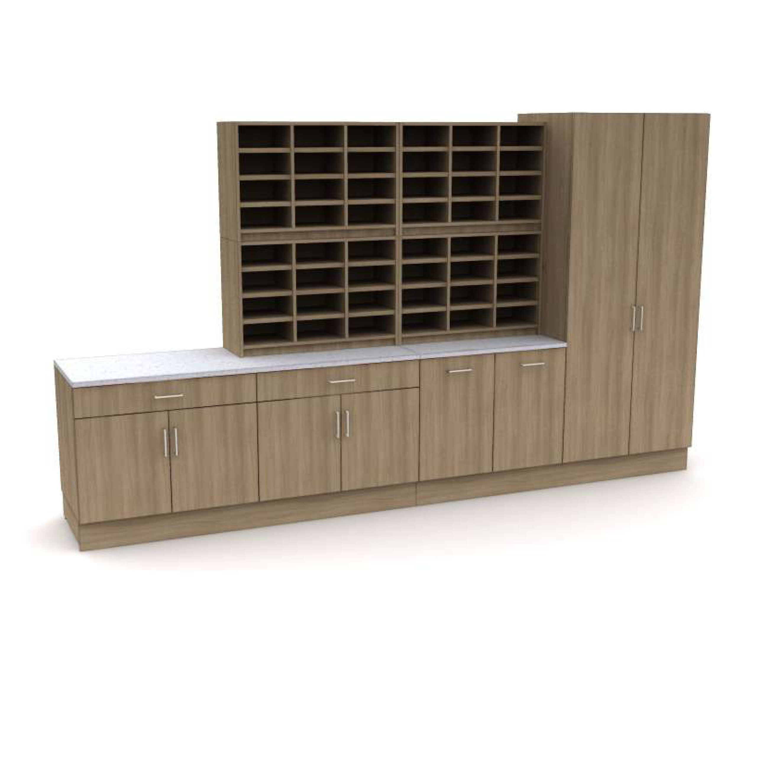 This modular cabinet system is designed to optimize organization and accessibility in high-traffic areas like nurse stations, clinical work hubs, and healthcare mailrooms. It features a seamless solid surface countertop, multiple base storage cabinets, a tall wardrobe unit, and an upper cubby system for document or mail sorting. Whether used to manage team mail, medical charts, or internal communications, this setup streamlines storage workflows and enhances visual organization in clinical environments.